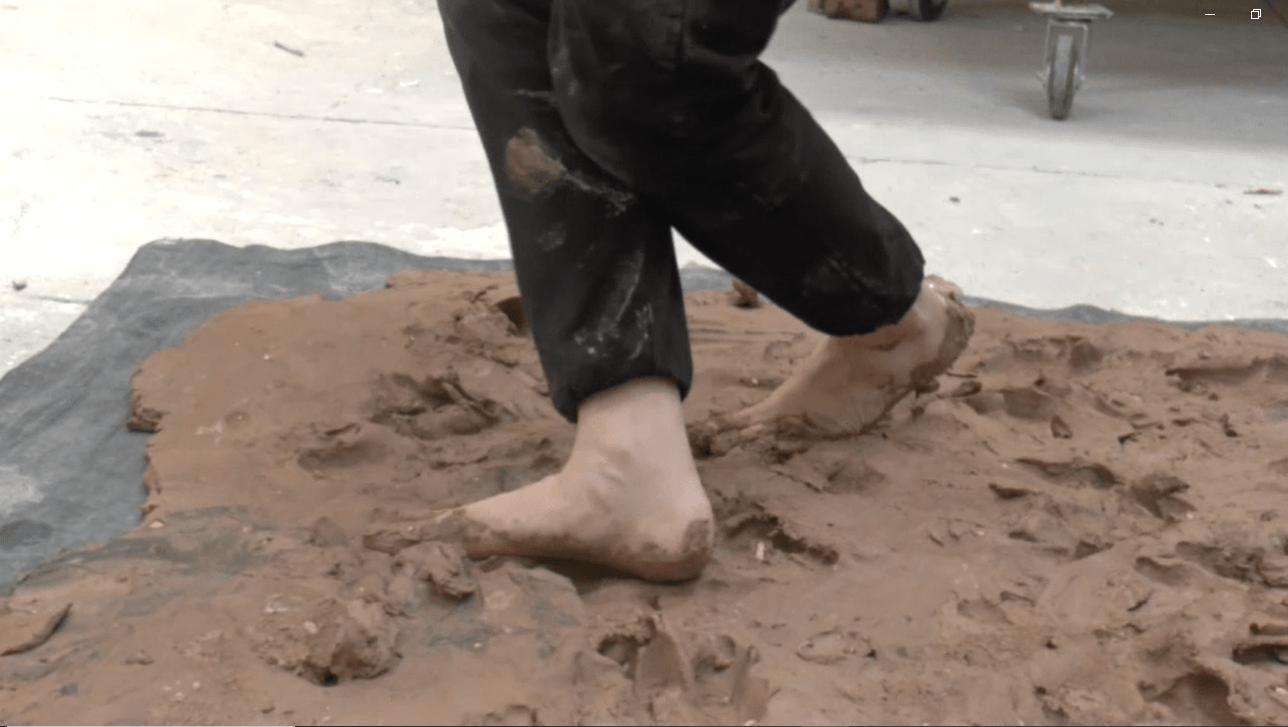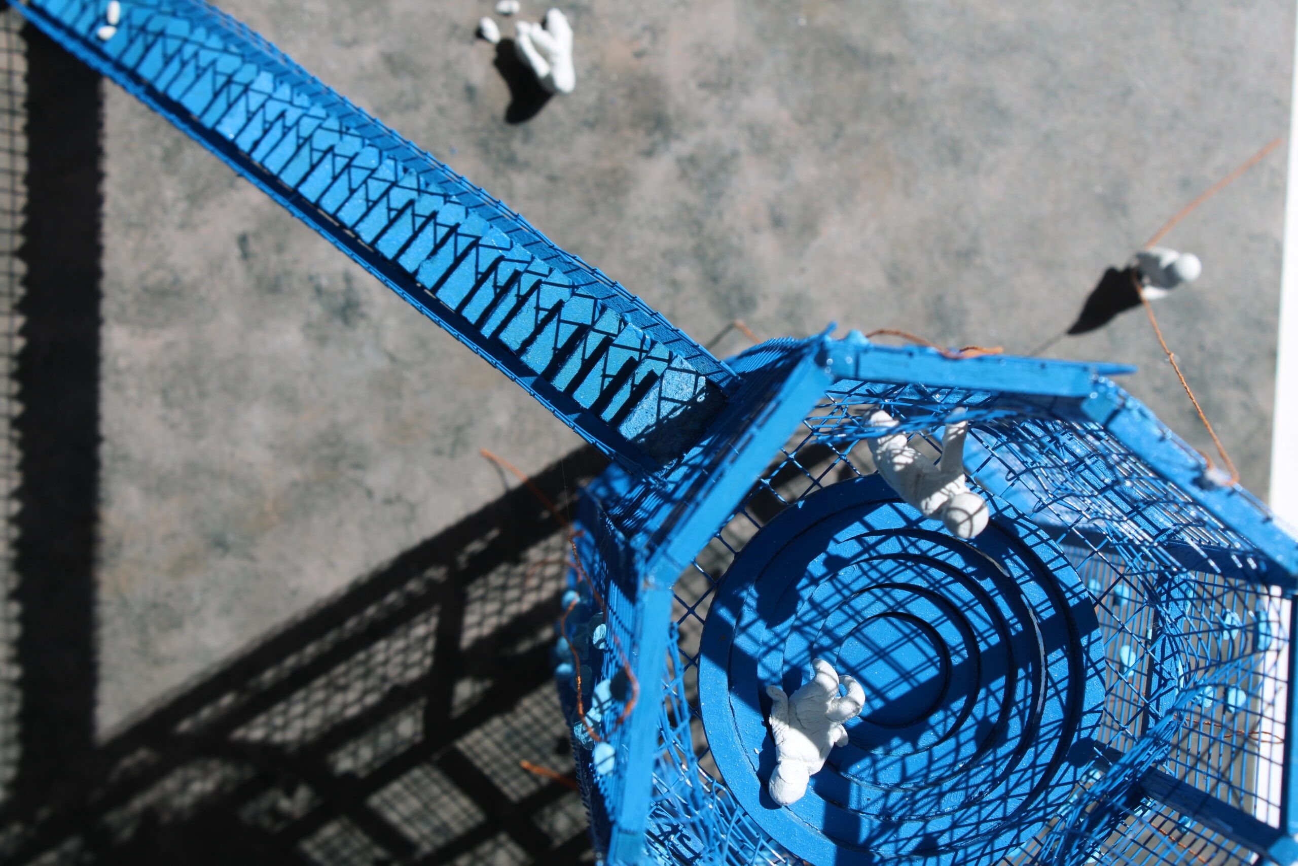 Bois, grillage en métal, pate autodurcissante, fil et bombe de peinture.