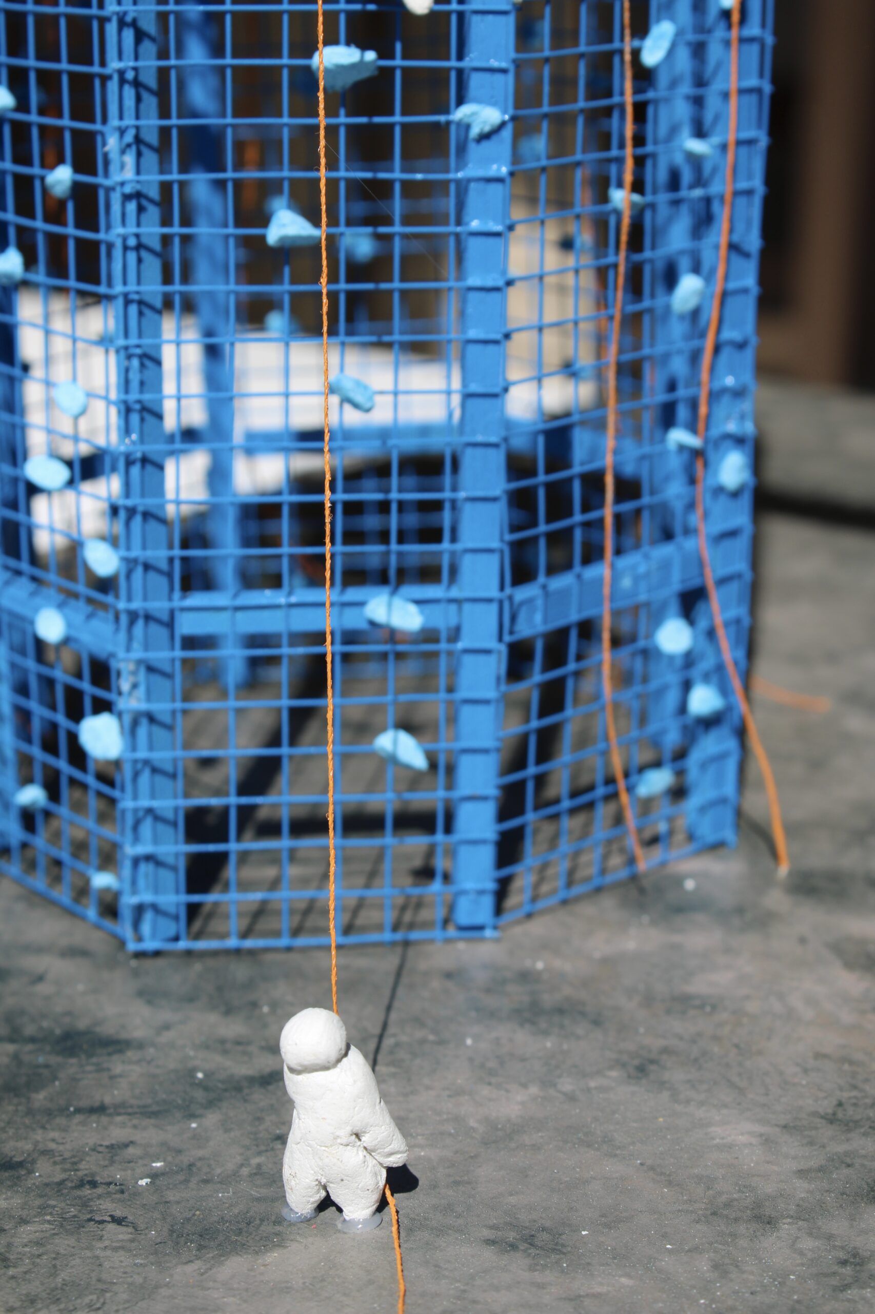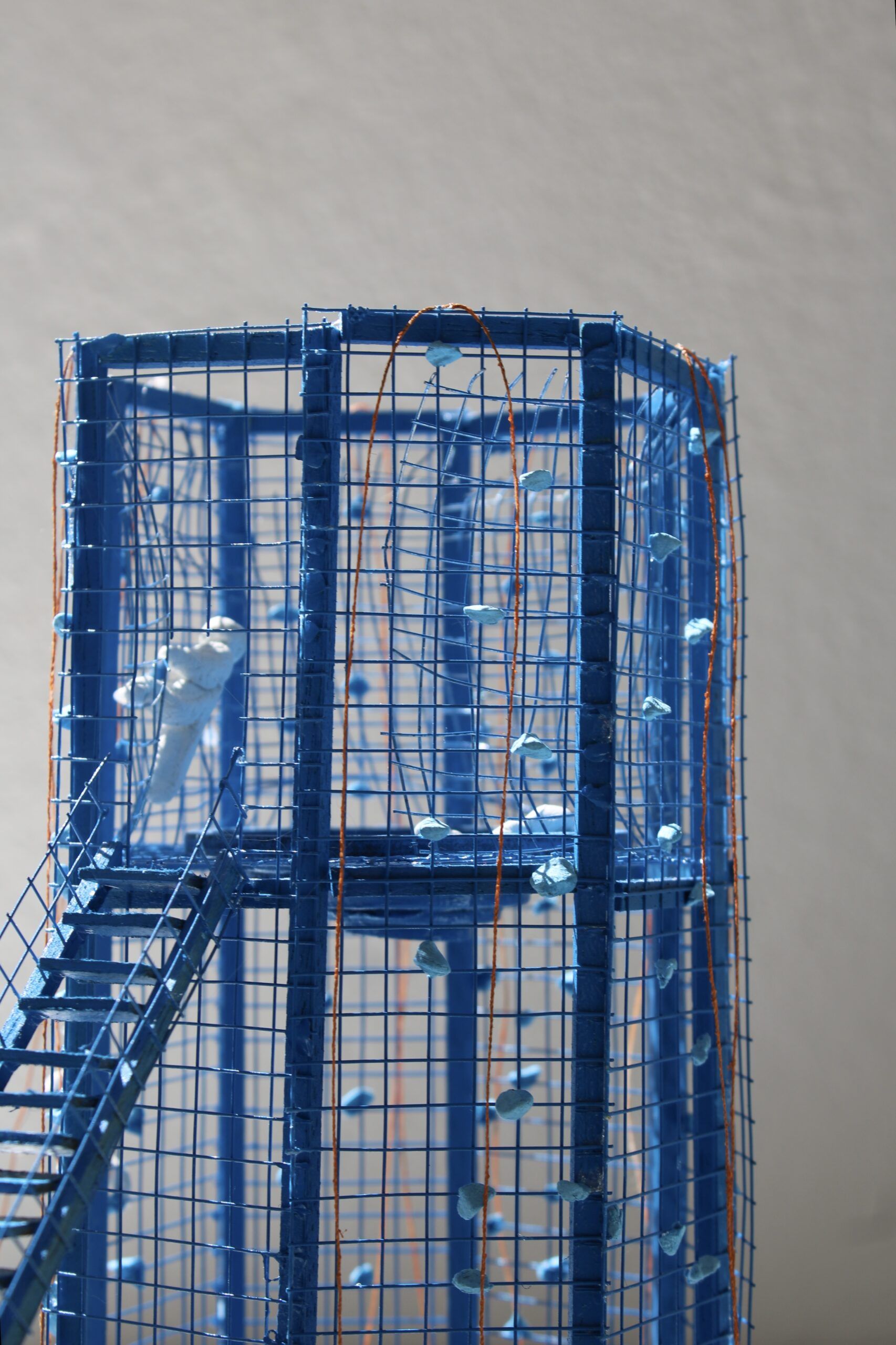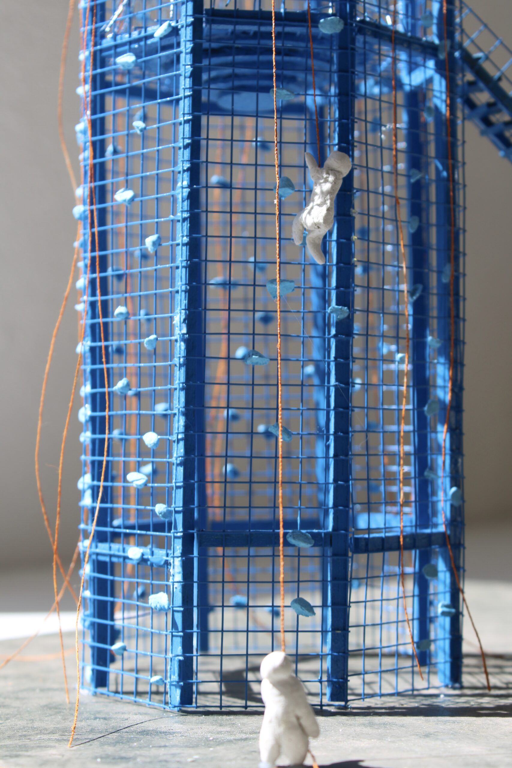 Bois, grillage en métal, pate autodurcissante, fil et bombe de peinture.