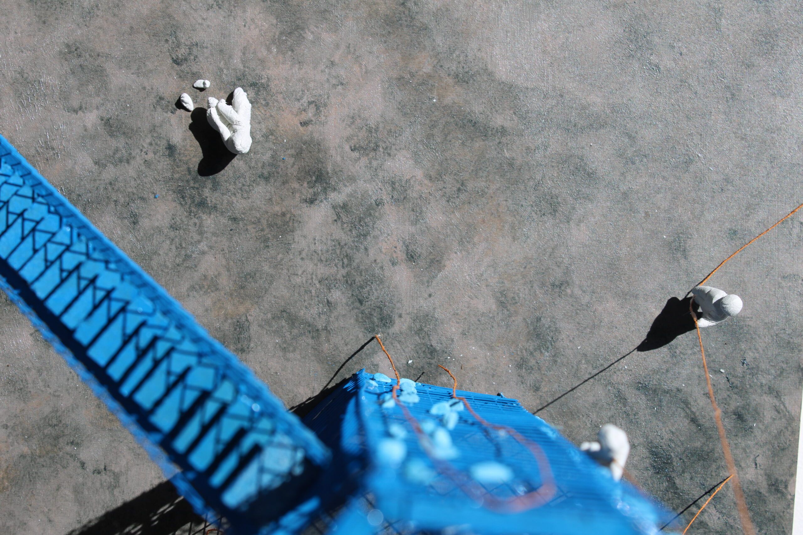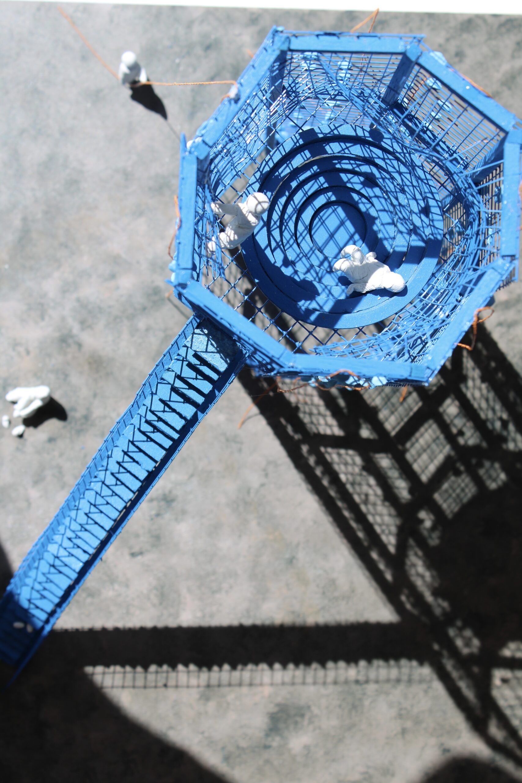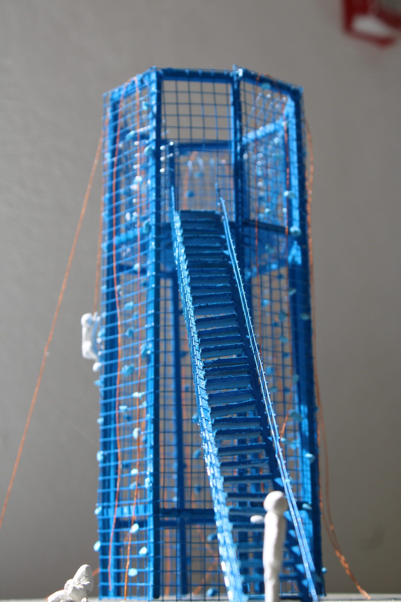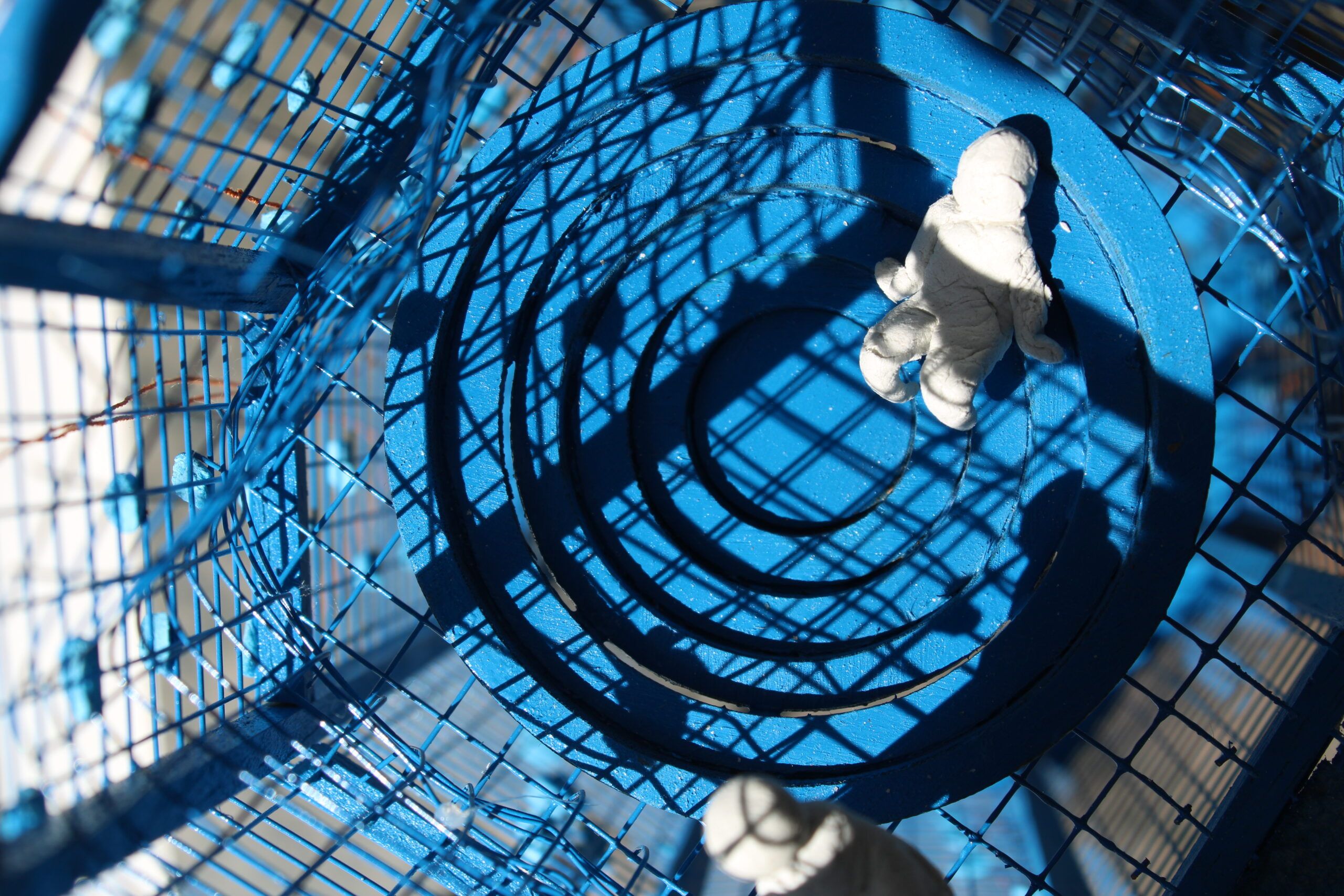 Bois, grillage en métal, pate autodurcissante, fil et bombe de peinture.